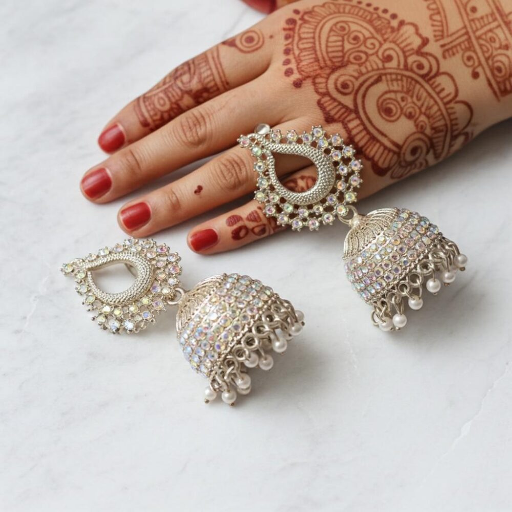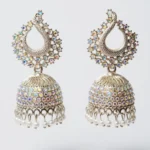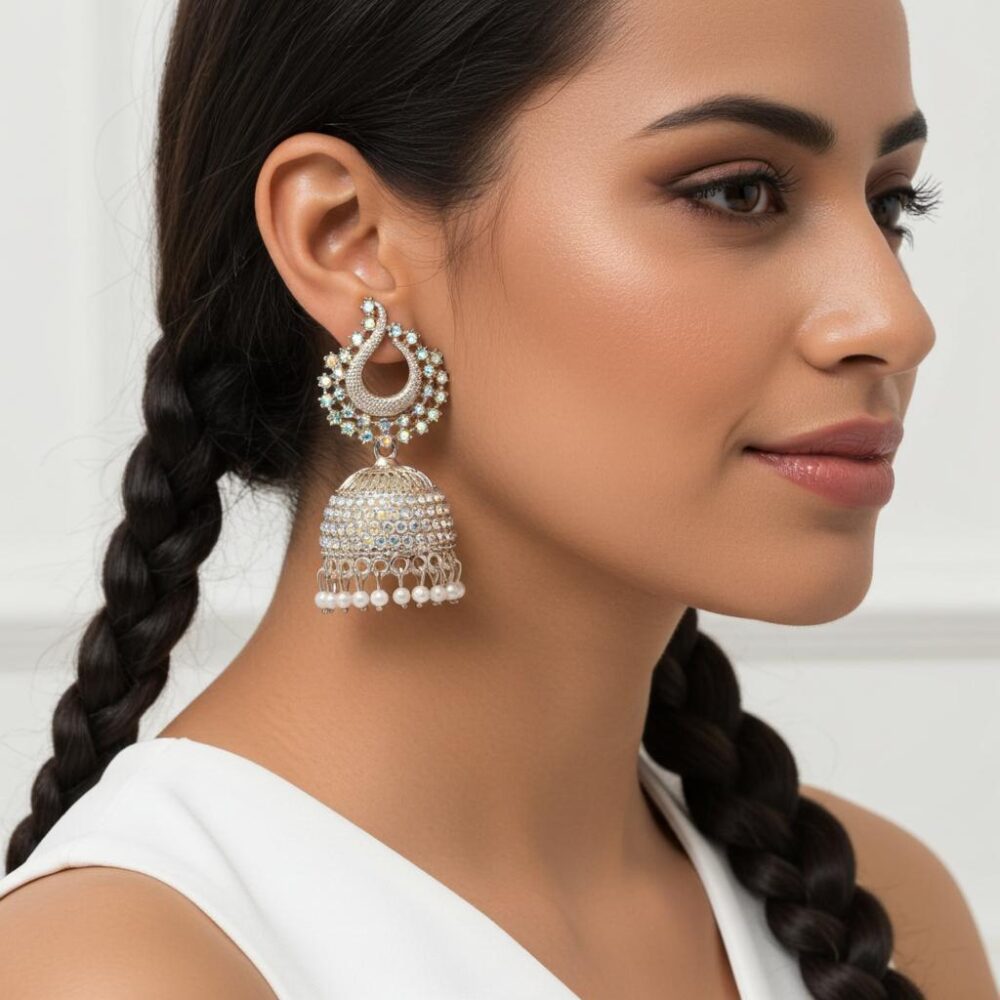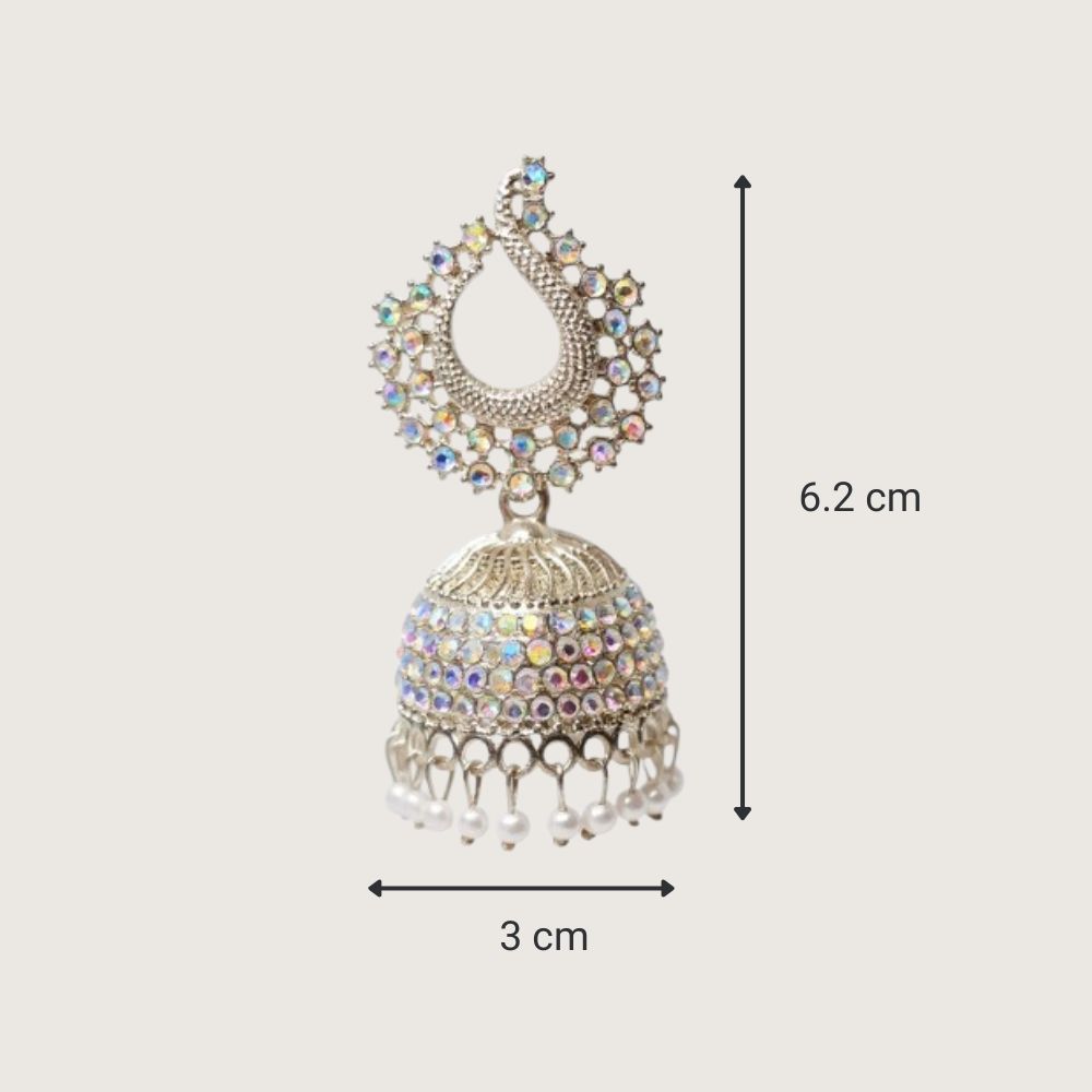 - Design & Style: Silver-tone jhumka with an AB crystal-encrusted paisley stud and dome, finished with a pearl fringe.