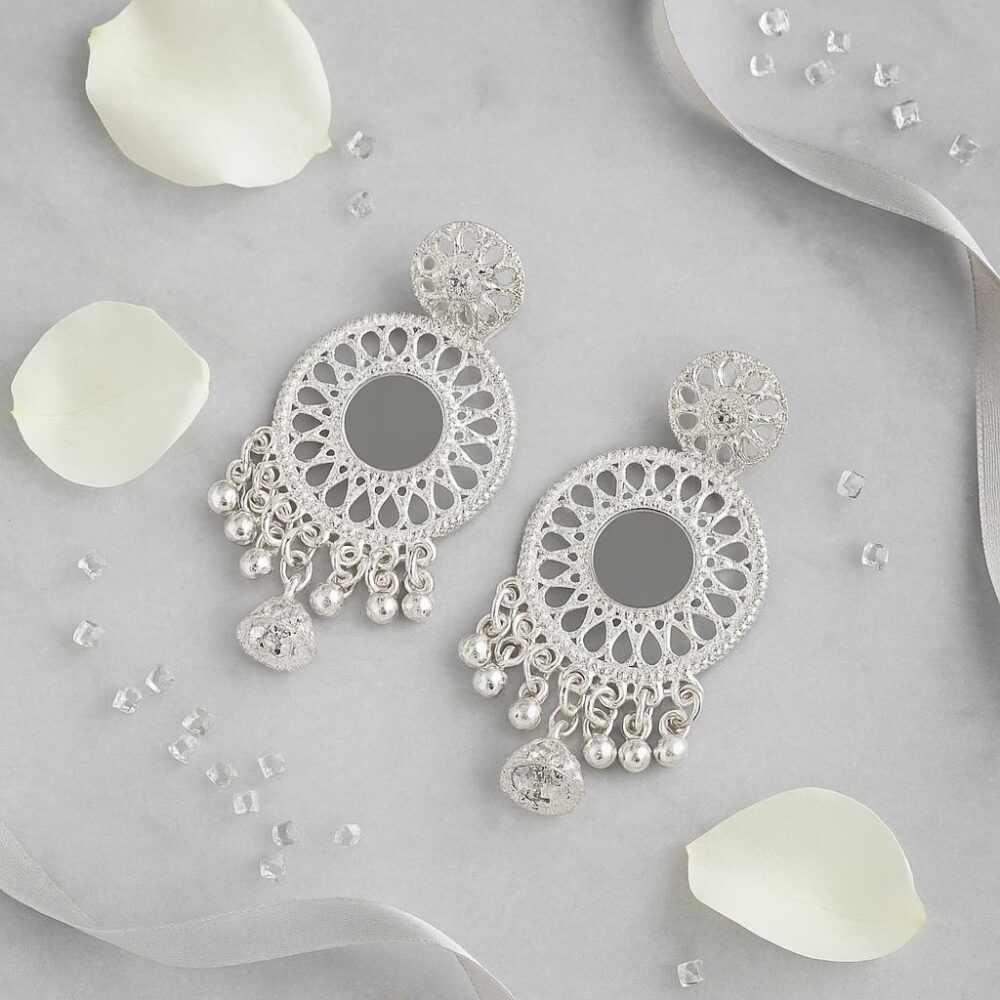 - Design & Style: Indian dangler in polished alloy with traditional mirror work.