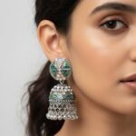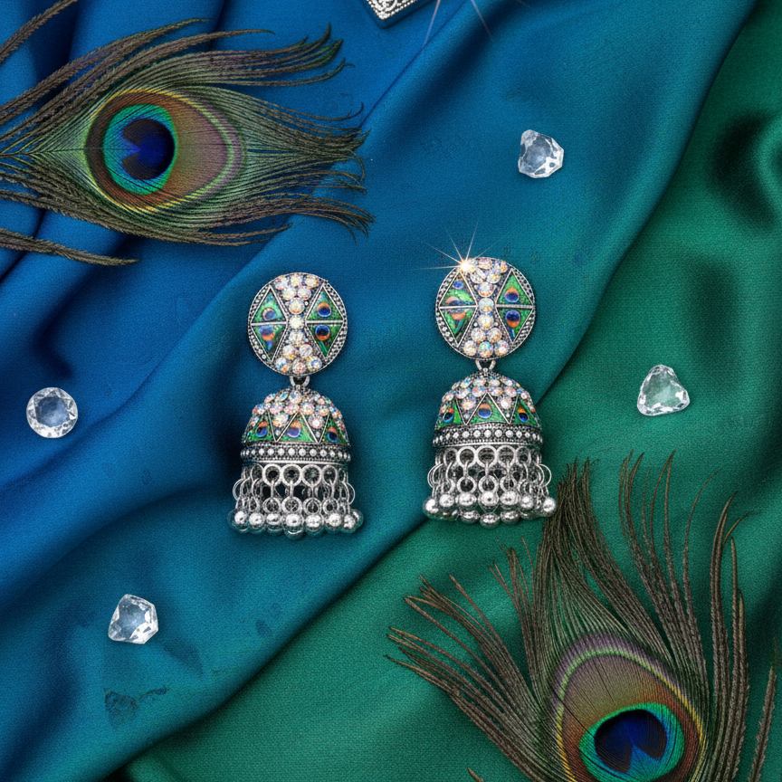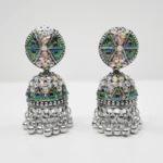 - Design & Style: Silver-tone jhumka covered in AB crystals and Meenakari accents, finished with a ghungroo fringe.
