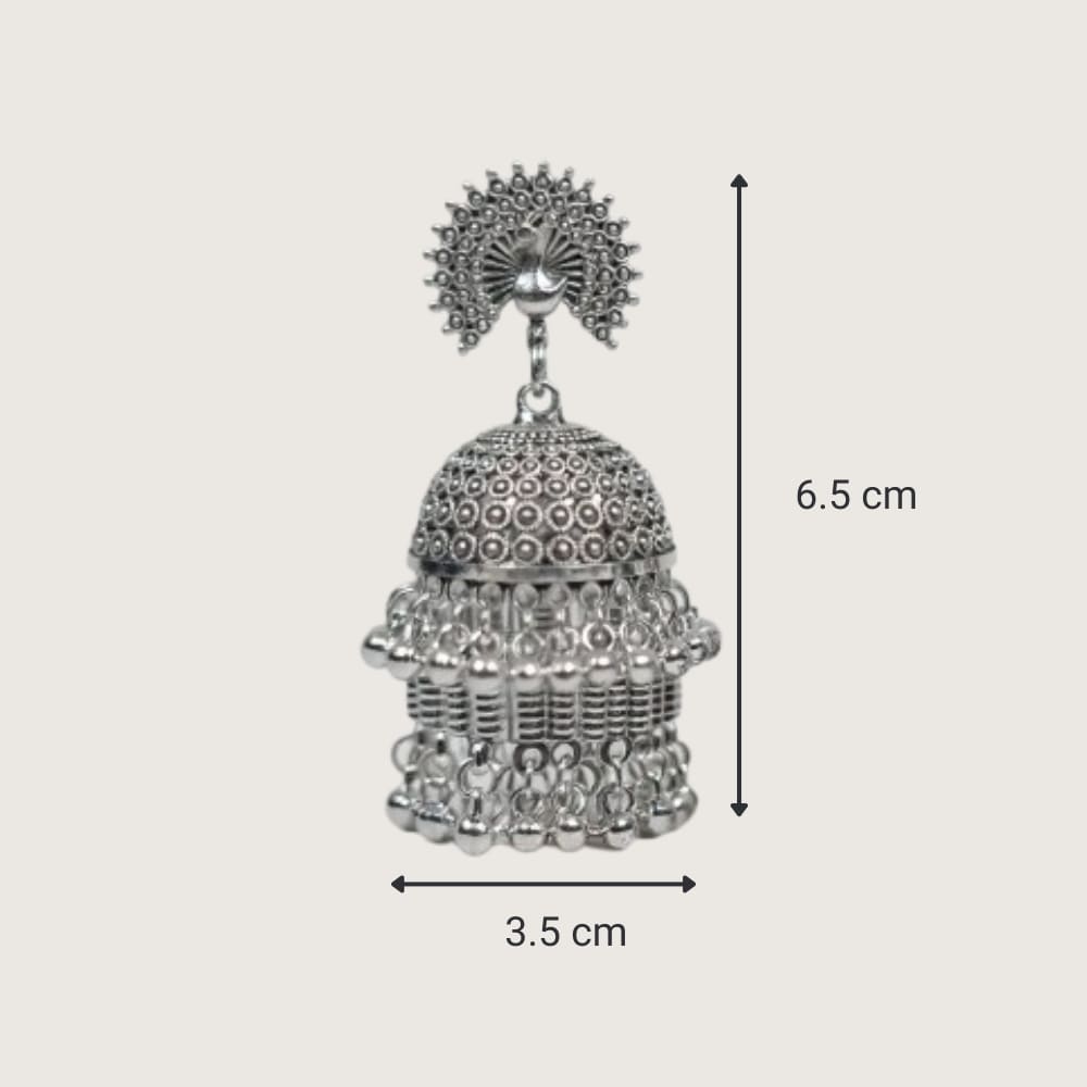 - Design & Style: Large, statement oxidised silver jhumka with a peacock stud and multi-layered ghungroo fringe.