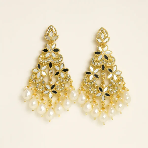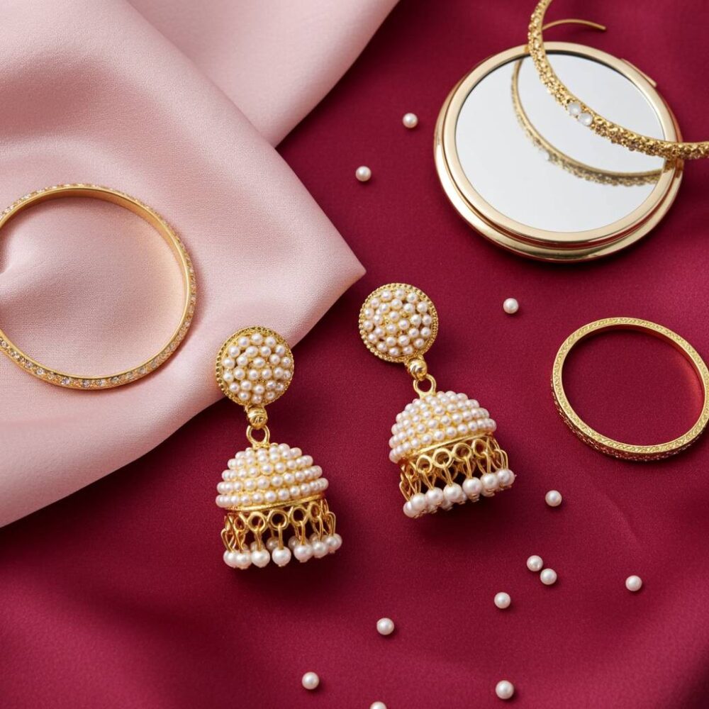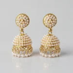 - Design & Style: Gold-tone jhumka fully embellished with white pearls (moti work) on the stud and dome.