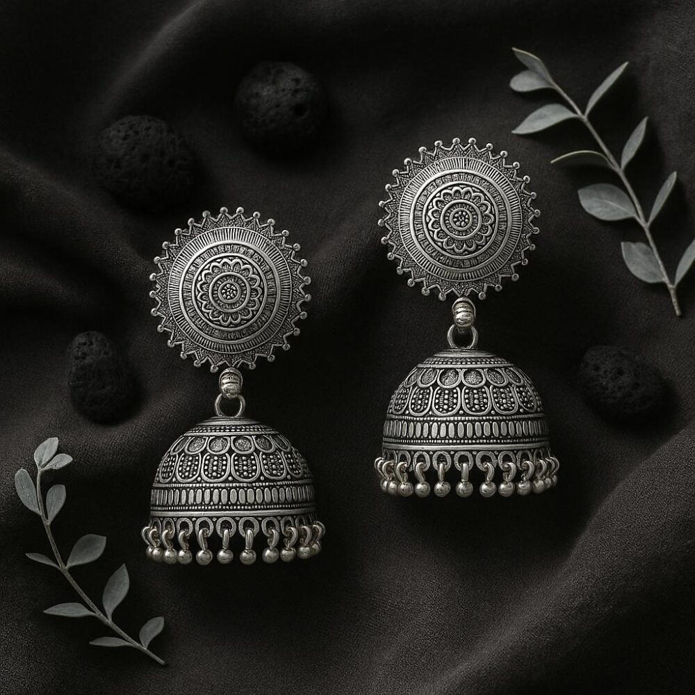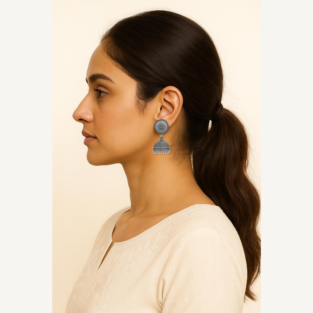 - Design & Style: Traditional dome jhumka in oxidised alloy.
